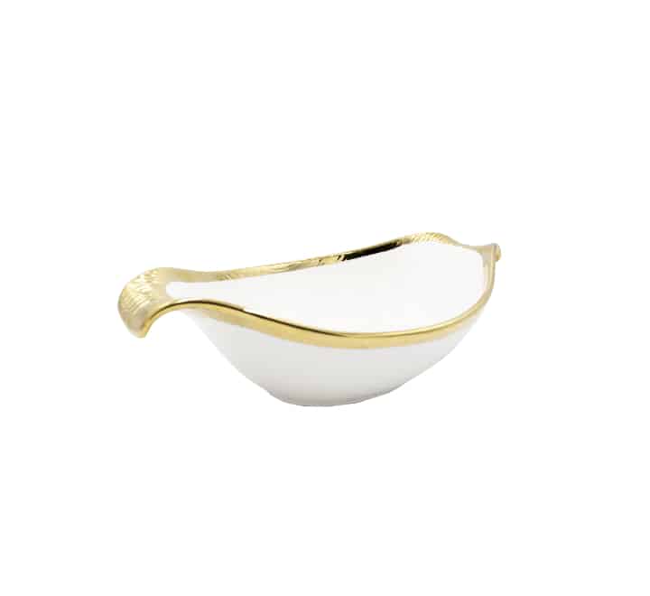 Combining sophistication and functionality with this oval shaped ceramic bowl. The unique shape and fine bone white and gold finish will brighten up any style or color of table linens or dining room decor.