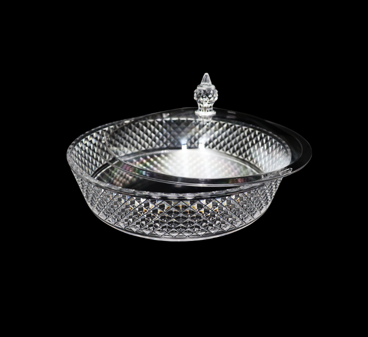 Beautiful round acrylic serving dish with lid. Can be used for serving desserts and savoury dishes. Perfect for displays, catering and buffets.