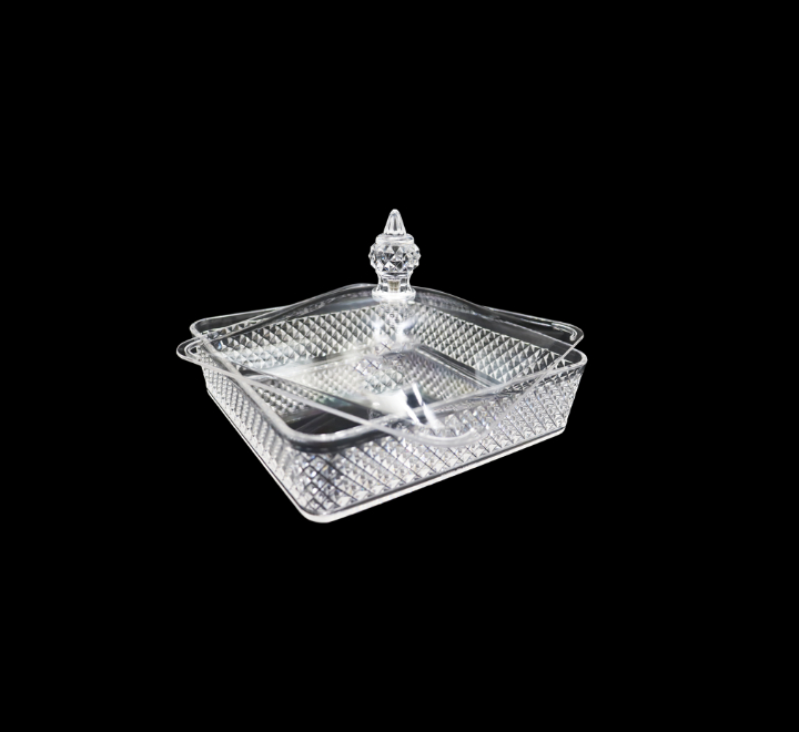 Beautiful square acrylic serving dish with lid. Can be used for serving desserts and savoury dishes. Perfect for displays, catering and buffets.