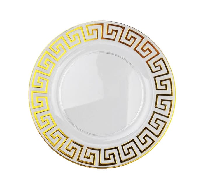 Fancy clear plastic underplate for all your special occasions featuring a beautiful gold pattern edging.