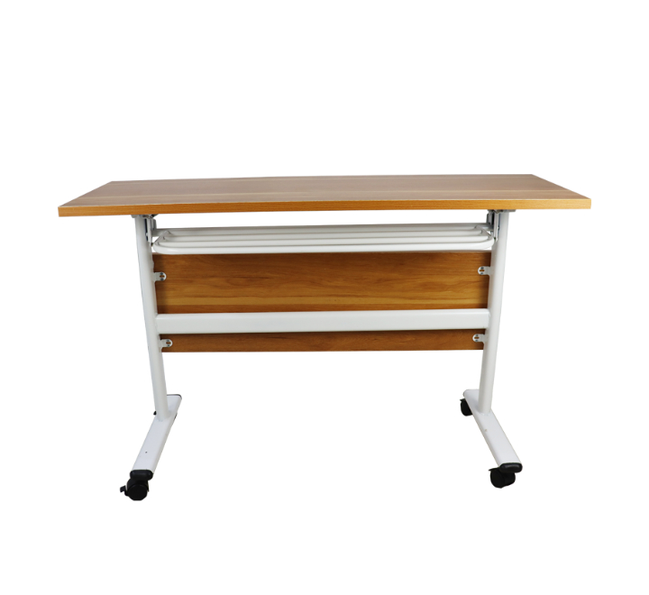 This is a folding table with a wooden top and metal frame. It features caster wheels for easy mobility, making it ideal for flexible use in offices, classrooms, or home environments.