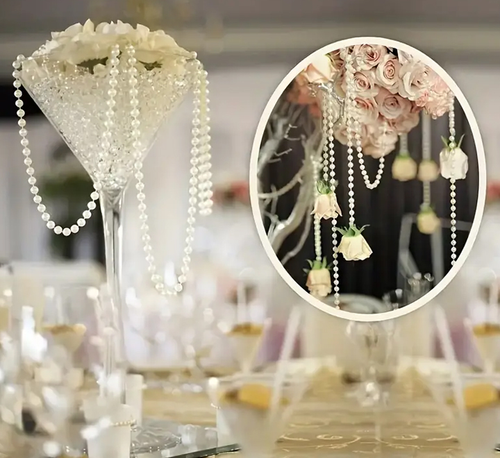 This faux pearl string garland is widely used for decorating favors, wedding decorations, table centerpieces, dessert tables, home decor, backdrops and more.