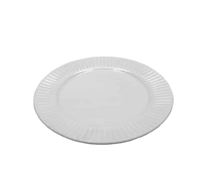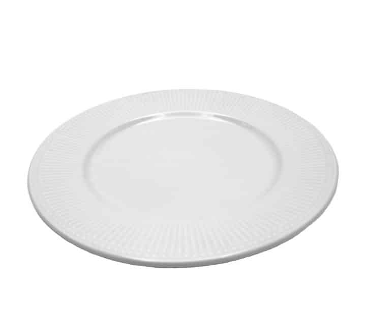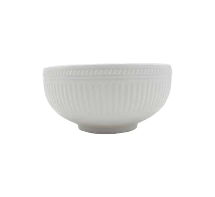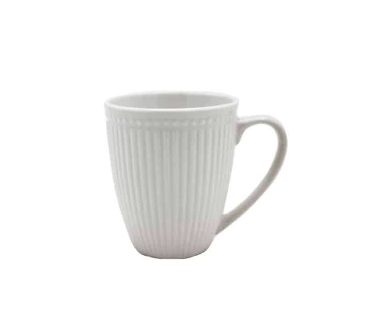 This ceramic dinner set features a linear ripple texture. It includes 4 sets of dinner plates, side plates, bowls and mugs. Features embossed stripe lines on a crisp white bone china body creating a striking statement.