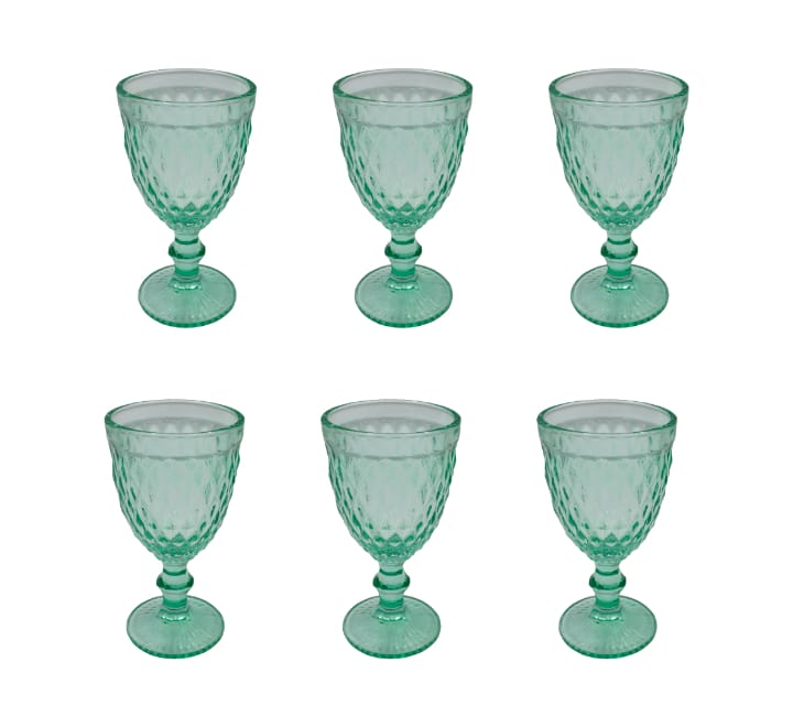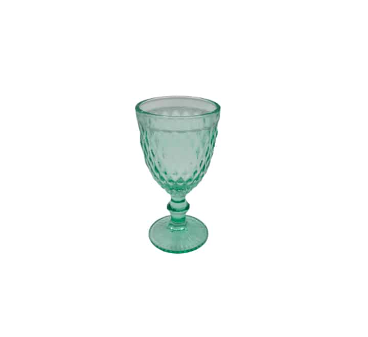 Modern vintage style wine glasses with beautiful diamond styling and a stunning green finish. Matching champagne glasses available.