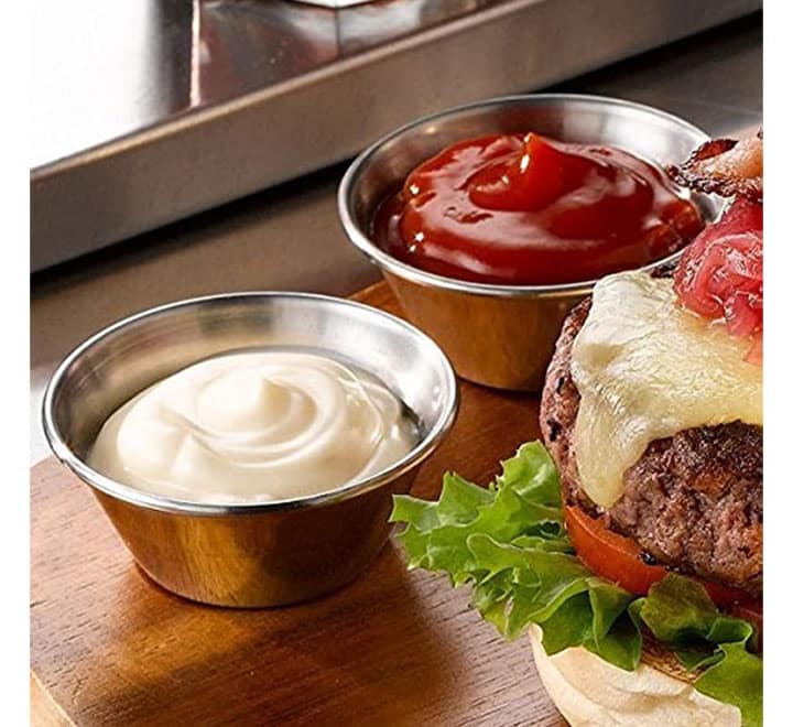 Serve your delicious dips, sauces and dressings with these small stainless steel cups that are perfect for serving individual portions of your ketchup, honey mustard and signature sauce.