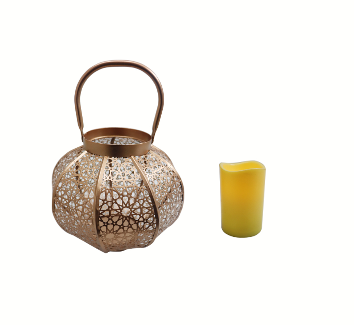 Add a warm, ambient glow to your space with this rose gold lantern, featuring a beautifully patterned design and a soft LED candle. Perfect for tabletops or hanging displays, it’s a versatile décor piece for homes, events and indoor or outdoor settings.