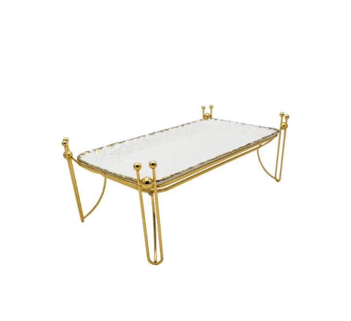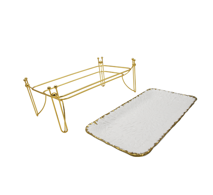Metal rack with a porcelain serving tray